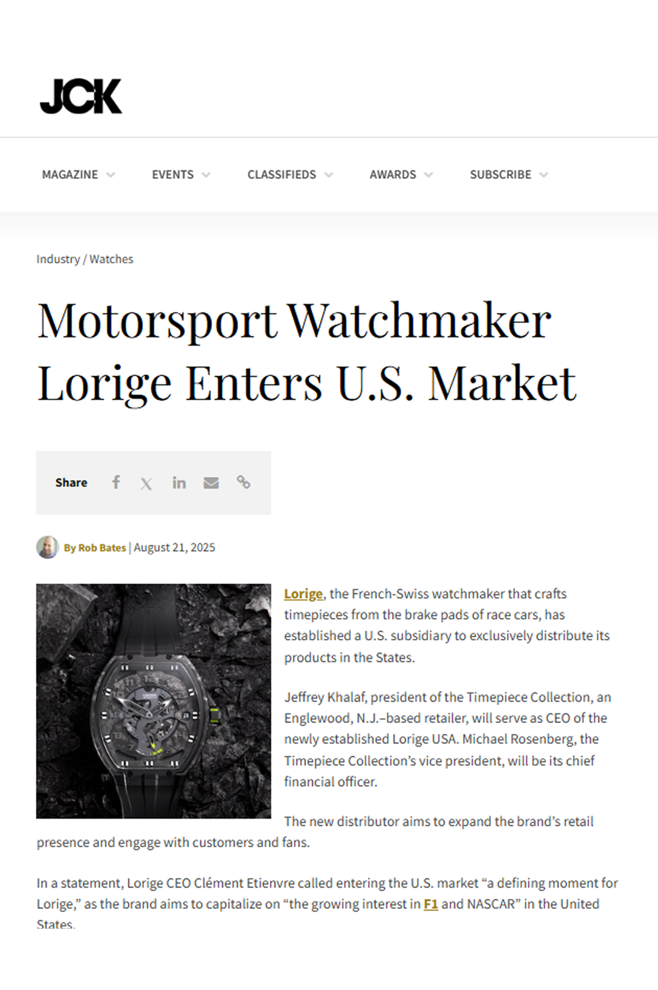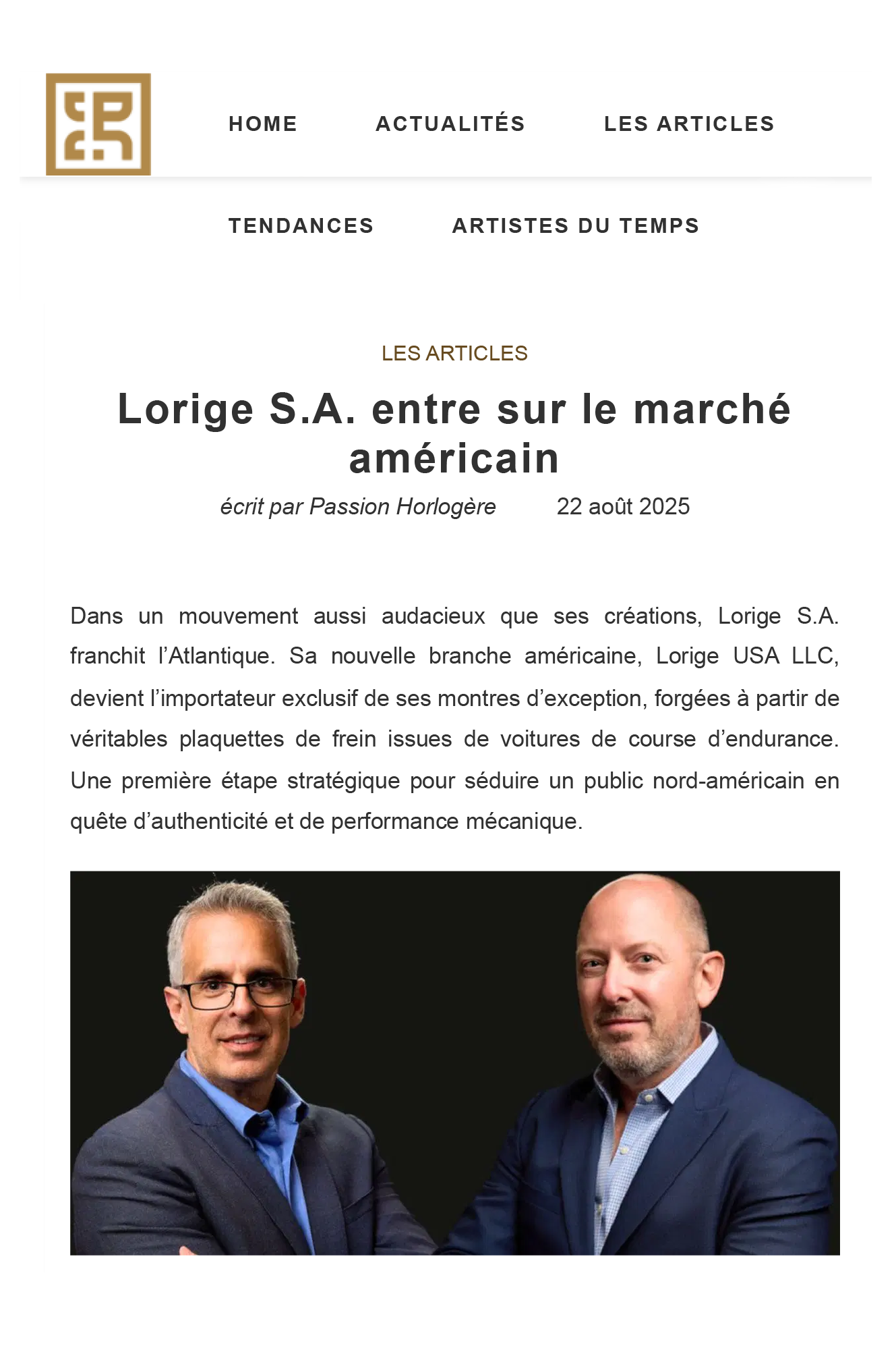 Founded in 2018 by Philippe Dumas, Clément Etienvre and Emeric Paraud, Lorige is a pioneering watch brand based in Paris and Geneva that draws its inspiration from the world of motorsport. The brand has developed cutting-edge technologies to recycle racing car materials, such as carbon from brake pads, to create exceptional timepieces. Since the beginning of the Lorige adventure in 2018, Timeless SA, through Georges Leger and its partners, has been able to accompany the brand to offer Lorige customers ever more exceptional timepieces.